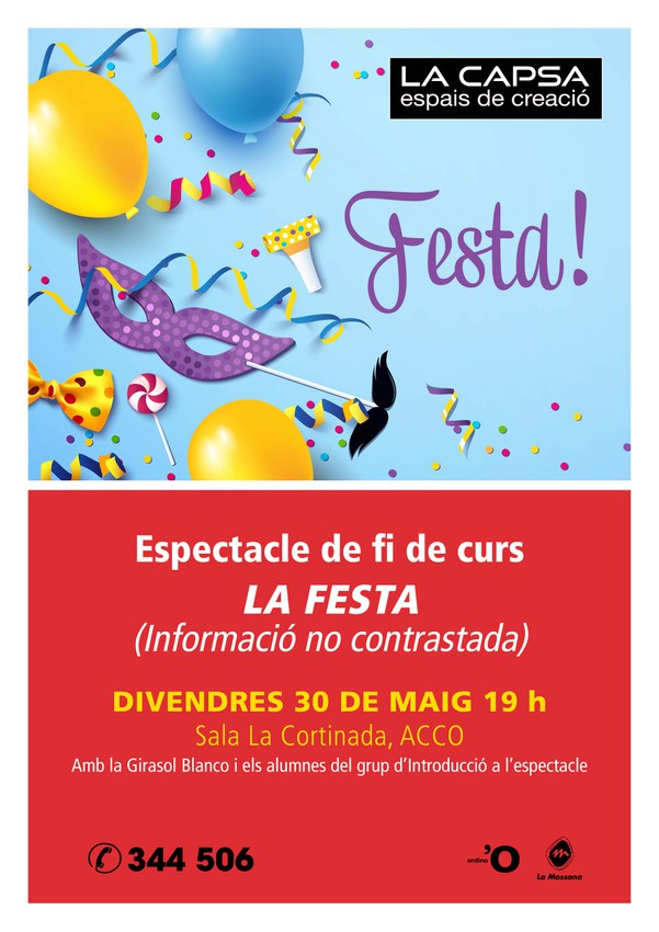 Els alumnes del grup d'introducció a l'espectacle de La Capsa dirigits per Girasol Blanco protagonitzaran l'obra de teatre 'LA FESTA (informació no contrastada)' de creació pròpia a la sala La Cortinada de l'ACCO (Andorra Congrés Centre Ordino). Serà divendres 30 de maig a les 19 h.