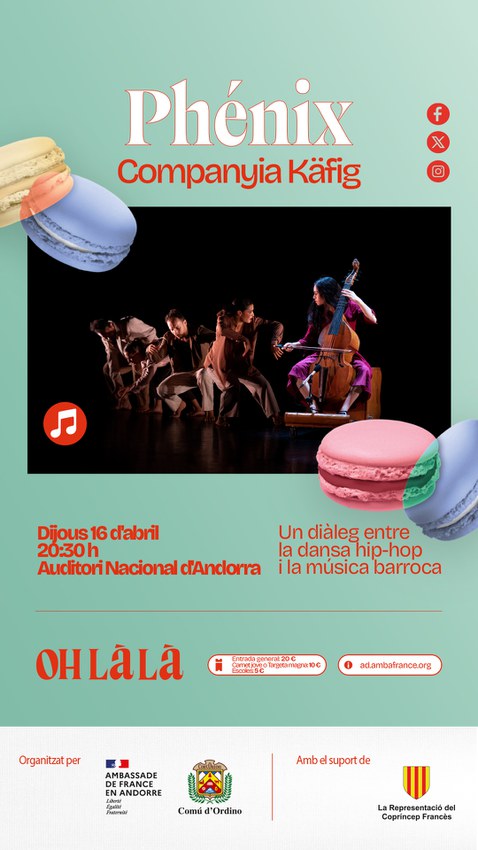 El Comú d’Ordino i l’Ambaixada de França a Andorra presenten Phénix, un espectacle que combina la dansa hip-hop amb la música barroca en un diàleg escènic innovador i captivador de la companyia Käfig. La proposta, emmarcada dins la Saison Culturelle, ofereix una experiència artística única que fusiona estils i èpoques a través del moviment i la música en directe.